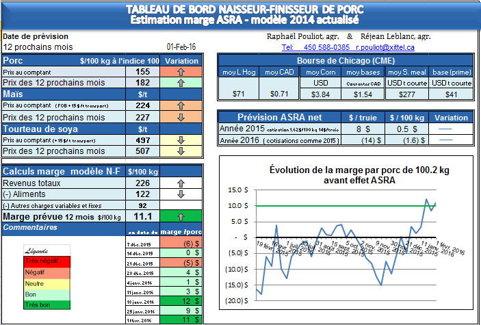 La marge du modèle naisseur-finisseur de la Financière Agricole, avec les données de fermeture des marchés à terme du vendredi 29 janvier est en hausse versus celle du 25 janvier 2016. Elle est maintenant de 11,1 $/100 kg.