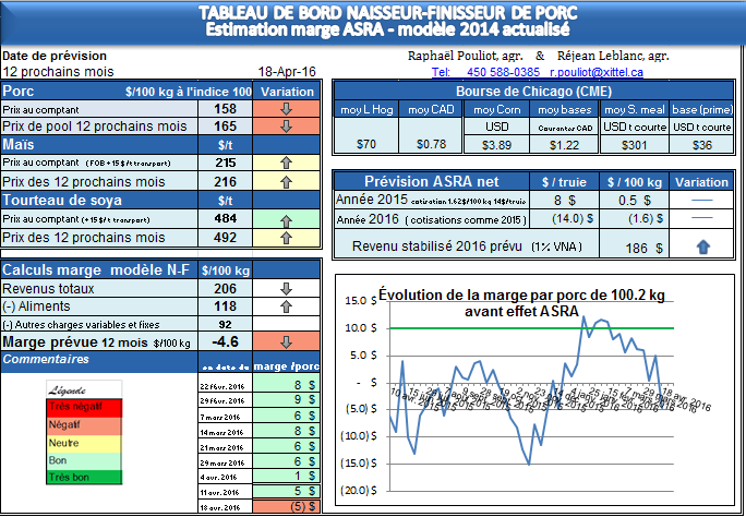 - Le plus gros de la baisse provient de la baisse de Lean Hog qui ont perdu un sous et demi la semaine passée, et le taux de change également a remonté , un peu en bas de 78 sous. Le prix du porc au 100 kg pour les 12 mois à venir n’est plus que de 165$ le 100 kg à l’indice 100 , ce qui est en bas du prix stabilisé aux prix de grains des 12 prochains mois. De plus, même l’année calendrier du 1er janvier au 31 décembre 2016 est maintenant en ‘’année de prix stabilisé ‘’, soit un prix de 166 $ le 100 kg ind 100 ( 185 $ par porc ), le prix stabilisé avec les prix de grains de l’année calendrier donnerait 186$ par porc de prix stabilisé; il y aurait donc en théorie une compensation ASRA en 2016, mais pour l’instant au net avec une cotisation à payer il n’y aurait pas de compensation nette ( pas de chèque ).