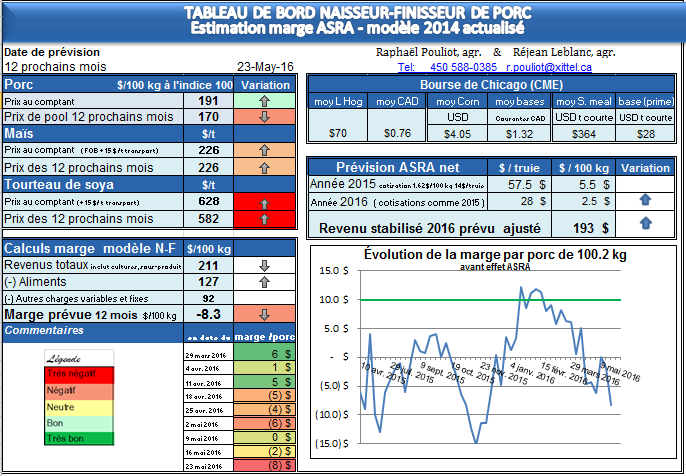 Bonjour , ce lundi 23 mai la marge du modèle naisseur-finisseur est en détérioration, à –8$ par porc.