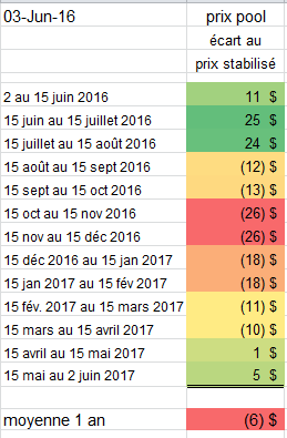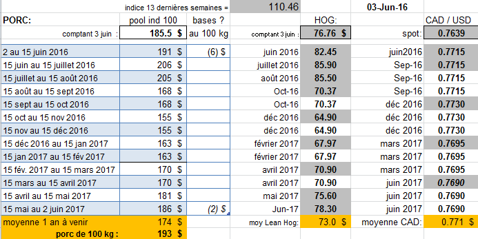 Nous avons 204 $ le 100 kg de prix de pool à l’indice 100 pour juillet et août, le spread entre les contrats d’été est élevé ( 20 $ USD, ordinairement de 13$ USD ), ou en canadien avec le taux de change un écart entre juillet 2016 et décembre 2016 de 50$ du 100 kg ind 100, alors que 32$ est la normale avec ce taux de change, les finisseurs en lots TP –TV ont d’ailleurs des marges prévisionnelles de 55 $ pour juillet-août présentement.