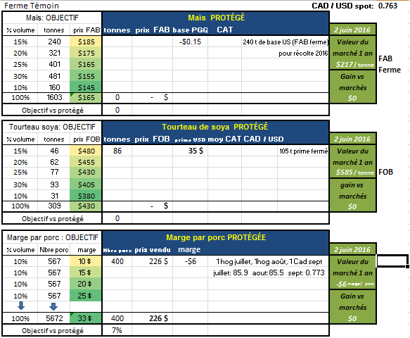 Conséquement, nous allons faire vendre des porcs à notre ferme témoin ( modèle virtuel ) pour l’été 2016 de petits volumes vu que l’année est quand même à pertes, 7 % seulement du volume annuel mais concentré sur juillet-août. comme on ne peut prendre de cld 7 sur le SGRM après le 31 mai et que nous sommes le 2 juin , nous allons vendre un lean hog de juillet 2016 , 1 de août 2016 et acheter un CAD de septembre , soit environ 400 porcs sous protection valant près de 90 000$ canadien (226 $ / porc ), nous serons donc un peu sur-protégés sur le dollar.