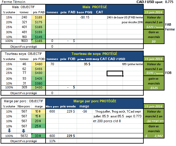 La marge à venir est tout de même encore négative à –6$ par porc, parce que le maïs monte pas mal, 225 $ FAB ferme, 241 $ livré 1 an. Donc notre ‘’ ferme témoin ‘’ naisseur-finisseur de 5672 porcs produits par an va prendre un autre 150 porcs pour août , par du cld 8 au SGRM , ce qui nous fera 350 porcs sur cette échéance , dont 200 par un lean Hog, globalement 75% des porcs de août seront protégés.