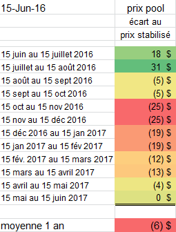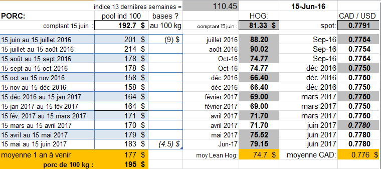 Bonjour , les hog ont encore monté hier, et avec la baisse présente du CAD, cela donne des prix au Québec pour l’été 2016 plus qu’intéressants; les porcs à livrer pour août rapporteraient 214 $ de prix de pool, 236 $ à 100 kg carcasse ( le cld 8 affiche 240$ , mais la fédération a mis une base de 4$ dans ce prix ) ; pourtant les prix pour l’automne/hiver sont beaucoup plus bas, que 157 $ de prix de pool pour décembre, soit un écart de 62$ par porc.