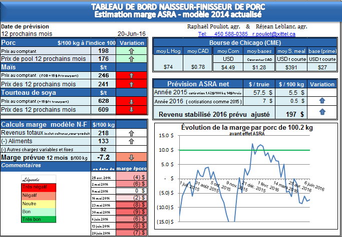Aujourd’hui lundi le 20 juin, la marge de la ferme modèle N-F est encore négative pour l’année à venir à –7$ par porc.