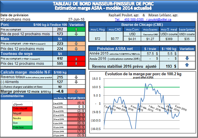Malgré la baisse du prix du porc et surtout associé à la baisse du prix des grains, la marge (toujours négative) c’est tout de même améliorée à – 4,60 $/porc de 100,2 kg.