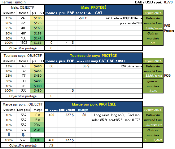 En effet les Hog ont beaucoup baissé depuis 2 semaines, le lean Hog de août est passé d'un sommet à 90$ US à 83$ US présentement... La ferme modèle détient présentement 600 porcs sous protection ( sur 5672 porcs produits annuellement ), concentrés seulement sur l'été 2016 ( ce qui n'est jamais idéal, surtout sur des positions rapprochées ! on l'avait fait parce que le spread était très fort, les prix étaient très intéressants pour l'été ) ; ses positions sont un Hog de août , un hog de juillet et un CAD de septembre pris le 2 juin, et 200 porcs de cld 8 pris le 15 juin lorsque ce cld affichait 240$ par porc de 100 kg carcasse ( base de 3.90 $ inclus dans ce prix, il s'agissait donc d'un revenu de vente par porc de 236$ ); comme ce cld affiche ce matin 224 $, 15 $ par porc de gain sur les marchés à terme est suffisant pour renverser ( à 224$, on n'aurait pas fait prendre cette position à la ferme modèle ) .