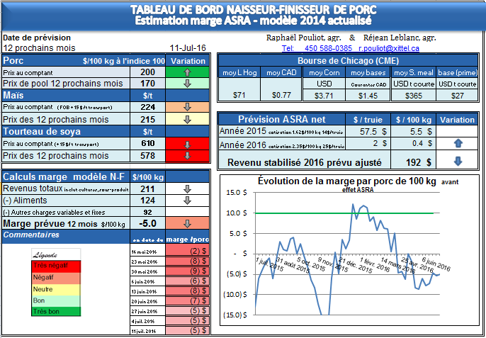 La FADQ a publié sa première mise à jour pour l’année 2016. Le modèle est maintenant à un poids moyen de 104 kg/porc. Nous continuons, comme le Men$uel Porc et la FADQ de publier au 100 kg.