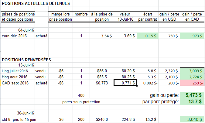 La ferme témoin naisseur finisseur de 306 truies et 5672 porcs produits va aujourd'hui liquider ses dernières positions de porcs, elle détient présentement 1 hog de juillet (85.9$) et 1 de août ( 85.5 $) , et un taux de change de septembre 2016 (0.773 $ ) . Ses positions au compte de courtage totalisent près de 14 $ par porc, ce qui est suffisant pour renverser et sortir des positions. Normalement on encaisse le profit de courtage une fois réalisé 15 $ par porc, mais dans ce cas il va nous manquer de temps pour le lean hog de juillet, qui vient à échéance demain le 14; comme le taux de change de 100 000$ canadien protège les 2 hog valant environ 45 000$ canadien chacun ( 200 porcs protégés/ vendus environ à 226$ ), on ne peut renverser le hog de juillet sans renverser le hog de août également, car nous avons une approche purement contrepartiste: on renverse les hog en même temps que le taux de change ! même si présentement on considère que les hog ont bien baissé ( c'est le temps de les renverser), mais comme nous sommes à pertes sur le dollar, on pourrait spéculer qu'il a de bonnes chances de remonter et attendre avant de le renverser, mais nous ne ferons pas ce genre de spéculation ( après tout, on pourrait renverser les hog, garder le dollar, et celui-ci pourrait continuer à s'effondrer jusqu'à 0.70 $ , en même temps que les hog continueraient leurs baisses aussi... c'est rare, mais nous ne prenons pas ce genre de risque. )