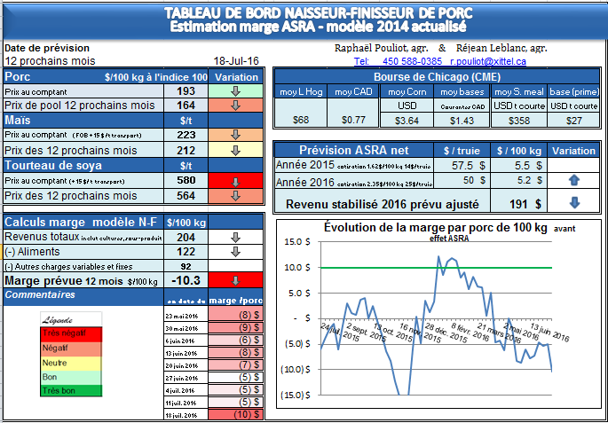 - La semaine passée les Lean Hog ont continué à baisser, en particulier vendredi dernier, le hog de décembre est maintenant en dessous de 60 sous, le contrat rapproché est à 77.9 $ US, et l’été 2017 aussi est à 77$ US; globalement cela donne un prix du porc pour les 12 mois à venir de 163$ le 100 kg à l’indice 100, bien en bas du prix stabilisé, et plus bas aussi que ce les producteurs ici ont reçu au réel en 2015... Nous calculons présentement que l’ASRA déclenchera en 2016 année calendrier, avec des sommes au net semblables à 2015, soit 50$ par truie et 5$ par porc, malgré que les cotisations soient à la hausse à 26$ par truie et 2.35 $ du 100 kg.