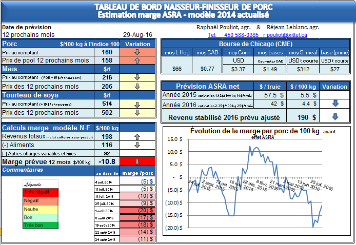 - Les hog ont fait une bonne remontée vendredi, le taux de change lui ne bouge pas beaucoup ( 0.77 ), le prix de pool pour les 12 prochains mois est de 158 $ le 100 kg à l’indice 100, soit à peu près le même prix que le comptant ( prix du jour à 160$ ); le prix pour décembre 2016 reste horrible, 136 $ le 100 kg à l’indice 100. La perte prévisionnelle pour des porcelets entrés en engrais aujourd’hui pour abattre à Noël est de plus ou moins 20 $ par porc avant frais fixes ( seulement les revenus moins les dépenses directes ) , dépendament de l’entente exacte de prix pour le porcelet ( on ne parle pas ici du porcelet spot, celui-ci vaut seulement 55$ présentement pris en Ontario pour du 55 livres ). Pour l’année 2016 calendrier ( du 1er janvier au 31 décembre ), nous calculons présentement un prix de pool de 161.50 $, l’ASRA paierait au net environ les mêmes montants que l’an passé ( en 2015 le prix de pool fut de 165$ le 100 kg à l’indice 100 , mais avec des grains plus chers que 2016 ).