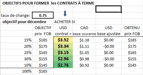 À 3.16$ sur décembre, le prix de bourse actuel correspond à du maïs à 165 $ pris à la ferme si la base est comme la moyenne 5 ans ( 0$ US ), mais avec un prix aussi bas à Chicago, il faut assumer que la base sera plus forte ( moins de pression de battage ), avec une base de 0.18 $ US cela nous donnerait du maïs 175$ pris à la ferme ( 1.29 $ base courante en CAD). La ferme témoin aura maintenant près de 25% de son maïs annuel protégé avec 3 contrats ( 3 x 125 t ).