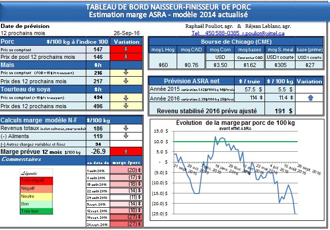 Peu de changement vis-à-vis la semaine dernière, la marge du modèle 1 an (septembre 2016 à septembre 2017) demeure à – 27 $/porc.