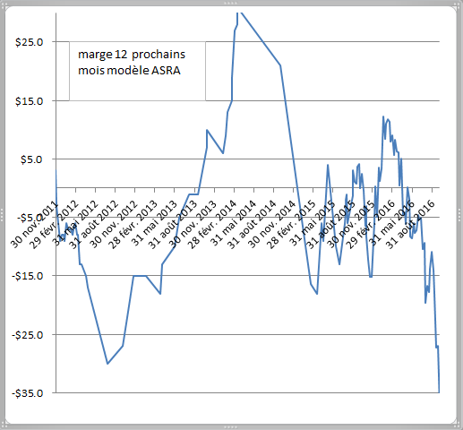 Les Hog ont chûté limit down vendredi avant la parution du rapport trimestriel du Hog and Pig, sur l’anticipation que les inventaires seraient très élevés ( à la parution du rapport, ils le sont ! plus élevés que ce que les analystes prévoyaient ). Le prix de pool pour un 1 an à venir est maintenant 136$ du 100 kg indice 100, soit 151 $ par porc de 100 kg. Sur ce graphique ci-bas on peut voir que la marge à venir est maintenant aussi basse que celle lors de la crise des revenus d’il y a 5 ans, de biens mauvais souvenirs ( ce graphique représente l’évolution des prix futurs offerts, et non pas les prix au comptant réels que vous avez eu.... ) . Le prix de pool pour décembre est de 106$, un éleveur en lot tout plein tout vide entrant un porcelet avec entente en septembre 2016 (70 $ à 30 kg ) , produirait des porcs avec une perte sur charges variables de 48$ par porc.... par conséquence Le porcelet de 55 livres de l’Ontario vaut 35 $ pris là-bas à 55 livres, 40 $ rendu au Québec; les porcelets au sevrage sont environ 20 $ livrés. Notre calcul d’ASRA nette à venir pour 2016 affiche présentement 11.4 $ par porc de 100 kg et 114$ par truie.