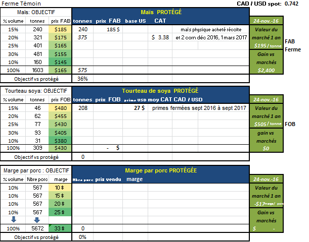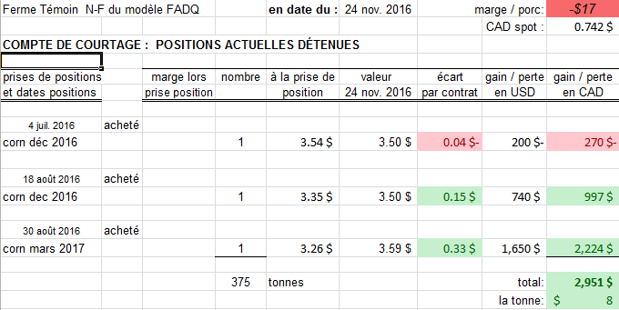 La ferme témoin détient également 3 contrats de corn au CME, ce qui porte son total à 575 tonnes de maïs, ou 36% de ses besoins annuels, comme ce que prévoit sa charte d’achat rendu aux prix actuels de maïs .