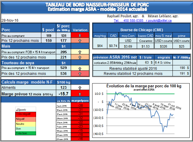 Notre modèle calcule présentement pour l’ASRA 2016, 6.4 $ net par porc de 100 kg ( 9.20 $ brut avant de soustraire 2.85 $ de cotisation ) comme compensation et 63 $ par truie ( 92 $ brut –29 $ de cotisation ) , la Financière vous envoie cette semaine une avance sur un calcul prévoyant payer 8.39 $ brut du 100 pour l’ensemble de l’année et 84$ brut par truie ... Le prix de pool que la Financière prévoit pour l’ensemble de l’année 2016 est le même que notre calcul, 158 $ de prix de pool, 174.75 $ par 100 kg carcasse comme revenu de vente, mais c’est sur le coût de production que la Financière a beaucoup retranché versus 2015, la FADQ prévoit 187.2 $ de revenu stabilisé ajusté par 100 kg ( ajusté = après avoir soustrait les agris que vous touchez en moyenne ), alors que c’était un revenu stabilisé ajusté de 194.8 $ en 2015... ( 8$ de moins comme revenu stabilisé ); si on le regarde avant les agris, c’est une plus grande baisse de revenu stabilisé, 198.8 $du 100 kg en 2015, 188.8 $ en 2016 . Pour ce qui est de notre suivi du modèle, nous calculons que le coût de production est 7$ en moulée moins cher en 2016 vs 2015 ( et non pas 10$ moins cher... ) , on peut donc espérer que la Financière revise en 2017 un peu à la hausse son prix stabilisé annoncé pour 2016 ...