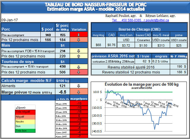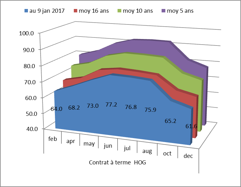 - les prix du porc au Québec au 100 kg ont reculé dû au taux de change, qui est passé de 0.74 il y a 2 semaines à maintenant 0.757. Au moins les Lean Hog ont repris une bonne partie de ce qu’ils avaient perdu lors de la parution du Hog and Pig le 23 décembre dernier, par exemple Juin 2017 était descendu à 74 $ US, vaut maintenant à nouveau 77 US ( 210$ de revenu de vente par porc de 100 kg en canadien ) . Revenu de vente de 184 $ par porc pour les 12 prochains mois à 100 kg, ( prix de pool de 166 $ ); les spread entre les lean hog sont à peu près rendus normaux, ce n’est que l’ensemble des prix qui sont sous la normale due à l’abondance de porcs aux États-Unis: