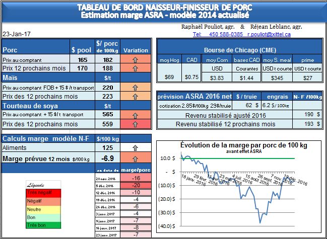 Le revenu par porc 1 an à venir augmente à 187 $, soit un prix de pool Qualité Québec de 169 $ le 100 kg; la semaine passée les lean hog ont un peu rebaissé, les contrats d’été 2017 ont repassé en-dessous de 78$ US, le taux de change avait baissé en début de semaine dans les 0.74, mais est maintenant un peu au-dessus de 0.75 , globalement le taux de change baisse depuis . L’augmentation du prix des grains ( surtout le soya ), donne un prix stabilisé potentiel de 193 $ par porc pour 2017, mais l’année est jeune , les grains ont bien du temps pour varier. Lundi passé le revenu par porc pour le contrat de juin donnait près de 213 $ par porc de 100 kg, 211 $ pour juillet, 209$ pour aout; même si la marge globalement sur an était à –7$ par porc due à des prix de grains en augmentation, des finisseurs en lots tout plein tout vide ont commencé des protections à ces prix , car ces contrats avaient atteint l’écart visé versus le prix stabilisé et fermaient des profits de 40$ à 45$ par tête pour l’été . À noter, le comptant à augmenté très rapidement au cours des 2 dernières semaines, tellement que le cash, 164 $ de prix de pool (66.9 $ US ) est maintenant plus élevé que le contrat rapproché de février ( 65.3$ US ) , ce qui n’est pas habituel à ce moment de l’année.