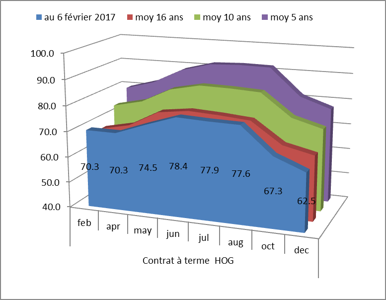 Ce sont les lean hog qui ont remonté la semaine passée, mais le CAD remontait lui aussi. On aurait 168 $ de prix de pool pour 1 an, 185 $ par porc ( avec les prix de fermeture de vendredi, les prix sont en bonne hausse présentement ce lundi matin, et le CAD en baisse ). Le contrat le plus cher, juin, est maintenant de retour à son haut réalisé le mois dernier, et même un peu au-dessus ce matin, il en va de même pour les autres contrats d’été. La particularité du marché actuel est que le prix au comptant ( cash ) est aussi élevé que le lean hog d’avril à venir, ce qui est inhabituel . Le contrat d’avril est à son plus haut à 71$ US présentement, ce qui est un peu au-dessus de sa moyenne historique sur 15 ans.