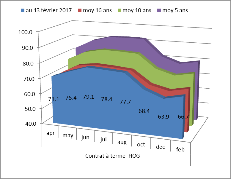 Le prix du porc au comptant a beaucoup monté, 73.2 US $ ce lundi ( 177 $ de prix de pool ), 73.8 $ demain mardi ( le hog de février finit demain à 74.8 $ , donc le comptant va être dans ces eaux-là, 180$ de prix de pool... ), mais surprenament le hog d’avril est beaucoup plus bas , 71$ US . Pour les échéance futurs, il n’y a pas de spread particulier, c’est juste l’ensemble des prix actuels qui sont trop bas pour que cela vaille la peine de protéger: