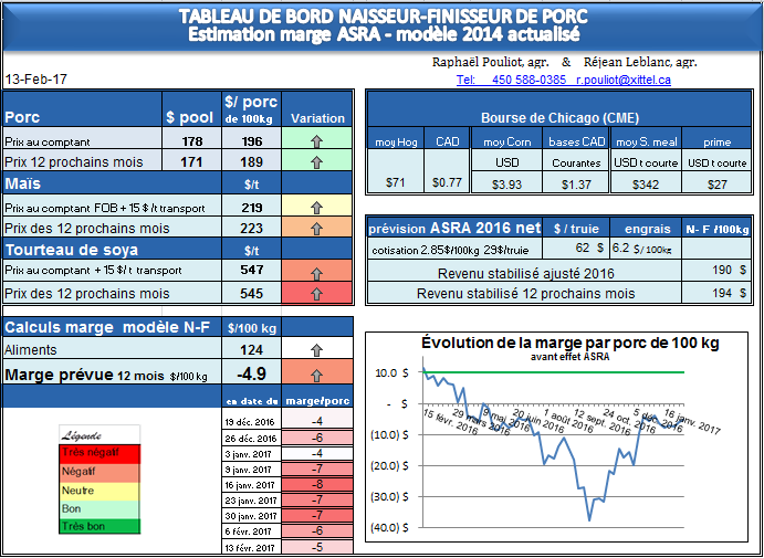 Nous avons eu de belles augmentations des prix du porc la semaine passée, en particulier mardi dernier lorsque la marge par porc pour un an avait atteint presque l’équilibre ( –1 $ par porc en fait, par exemple le hog de juin avait brièvement atteint 80 $ US , 214 $ de revenu de vente par porc de 100 kg, le taux de change aussi était passé en bas de 0.76 , plusieurs producteurs ont placé quelques volumes de porcs sur des cld, ou par le compte de courtage mardi dernier.... ), mais les prix ont ensuite redescendu sur la fin de la semaine, en date de vendredi à la fermeture , marge à –4.90 $ par porc de 100 kg naisseur-finisseur, avec un prix de pool futur de 171 $ du 100 kg, prix de vente par porc de 188 $.