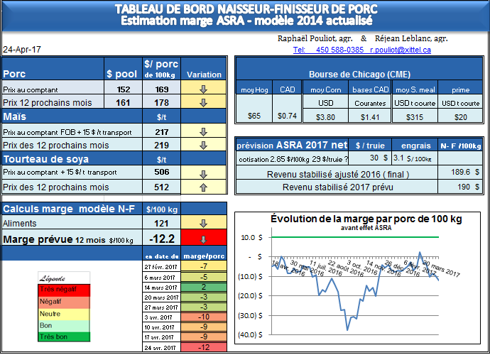 La marge 1 an à venir du modèle N-F de la Financière Agricole est présentement de –12 $ par porc. Le comptant baisse, encore, présentement 61$ US, 152$ de pool.