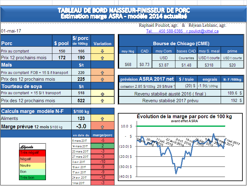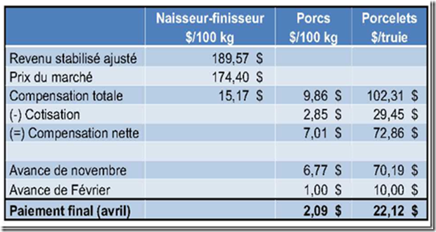 La semaine dernière, la Financière agricole du Québec a versé les montants finaux pour 2016. La compensation naisseur finisseur est de 15,17 $/100 kg et nous avions estimé de notre côté 16,20 $/100 kg. De notre côté, nous publions le tableau de bord le lundi, ce qui peut donner une différence sur le prix de pool moyen. On calcule toujours 1 an en continu.