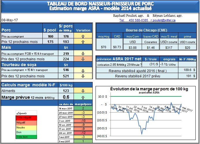 - Les porcs de 100 kg carcasse rapporteraient présentement 193$ à l’indice moyen pour toute l’année si on protégeait toutes les échéances; le prix au comptant commence enfin à décoller, le prix du jour est de 62.9 US, ce qui fait un prix de pool de 160 $ ce lundi ( on avait commencé la semaine passée à 150 $.... ), le lean hog de mai qui termine ce vendredi 12 mai ( 10 eme jour ouvrage du mois ) est à 69.40 $, énorme écart pour si peu de jours ( ce serait un prix de pool de 175$ pour la journée de vendredi le 12 ! ) , il va donc y avoir de l’action cette semaine, soit sur le prix au comptant qui va très vite monter (64.2$ demain mardi ) , ou soit sur ce lean hog qui va très vite descendre.... ou un peu des deux... Un porc de 100 kg rapporte 214$ par porc pour cet été présentement (194 $ de prix de pool ) grâce au taux de change à 0.73, cela donne 22 $ par porc au-dessus du prix stabilisé de 192$, des prix intéressants.