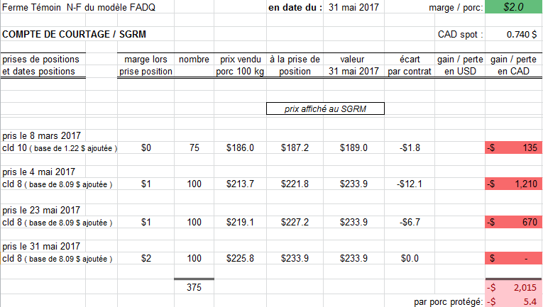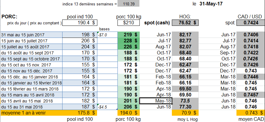 Aujourd'hui mercredi 31 mai, grosse augmentation des hog ( encore une fois principalement l'été 2017, près de 2 sous sur juin-juillet, 1 sou sur aout ) , en plus le taux de change baisse à 0.74 ... La ferme N-F de 5672 porcs vendus par an ( 475 par mois ) va vendre une 3 e tranche de 100 porcs sur cld 8, ce qui lui fera 300 porcs sur ce mois ( prix affiché au SGRM de 234 $, soit 226$ de revenus par porc de 100 kg ). Pas de position sur juin et juillet car trop proches, et les mois à partir de l'automne leur manquent encore quelques dollars... Le prix au comptant est 76.5 $ US, alors que le contrat de juin auquel il ne reste que 15 jours est à 82$ US.... c'est donc une augmentation à venir du prix au comptant de 15$ en quelques jours si les prix de bourse tiennent !