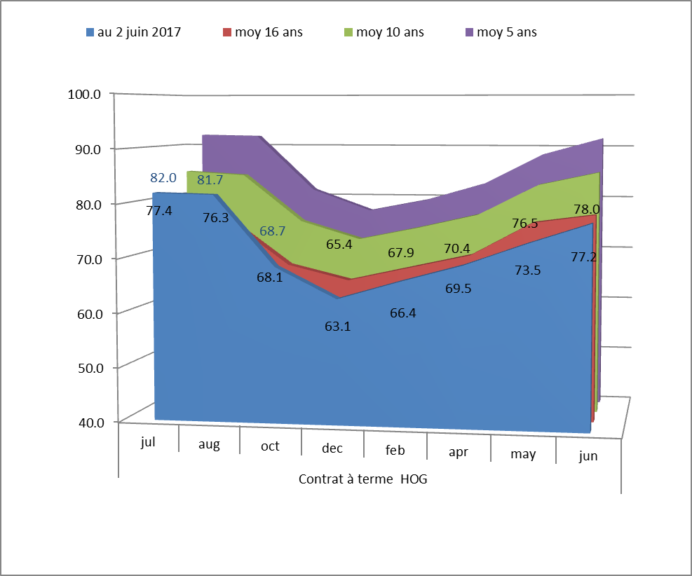 - De l’action intéressante pour les producteurs de porcs ces derniers jours, alors que le hog de juillet avait atteint 83 US, octobre a aussi presque atteint 69 US, décembre monte enfin un peu à 63 US.. Le prix du jour est présentement de 77 US ce qui fait 192 $ de prix de pool avec un dollar à 0.741 ( 212 $ par porc de 100 kg carcasse ); d’ici à ce que le Hog de juin finisse ( le 14 juin ) le prix au comptant serait de 81 US, 223 $ par porc si la bourse maintient ses prix. Les prix pour cet été 2017 sont plus qu’intéressants ! ( juillet a atteint 228$ par porc de 100 kg la semaine passée, 38$ par porc au-dessus du prix stabilisé, alors que la norme est de + 20 $ pour ce mois ) . En plus le potentiel de hausse est toujours là pour le court terme, la carcasse vaut 91$ US, on n’a pas encore atteint le moment de l’année où les prix montent à leur plus haut historiquement, la marge des abattoirs aux États-Unis est actuellement de 49$ par porc ( 49 $ est la marge des packers, la marge de l'abattage seulement, entre la découpe à 91$ et la carcasse à 77 $ est moins que ça... ) prudence donc pour fermer ces contrat élevés d’été ( en petits pourcentages, par strates ).