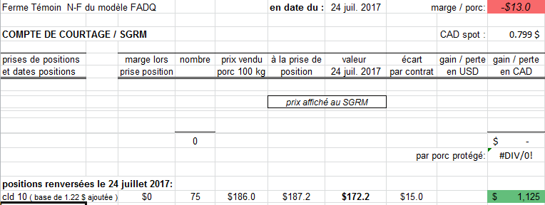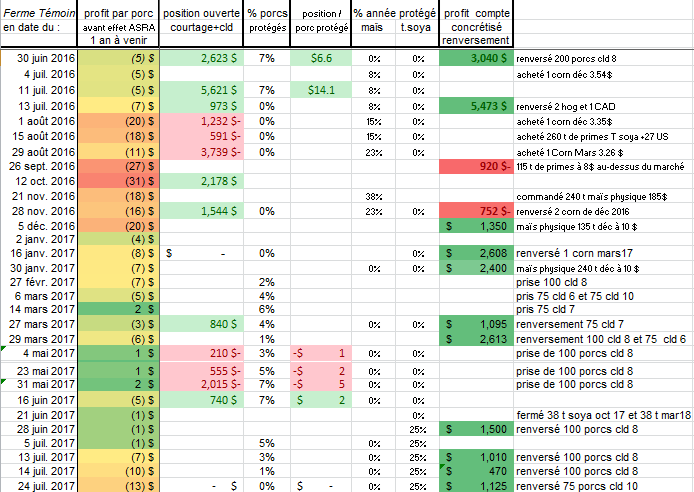 La marge est présentement de -13$ par porc de 100 kg pour 1 an, les hog baissent ce matin, la ferme Témoin de 306 truies produisant 5672 porcs par an va renverser ce qui lui reste de cld, soit le cld 10 ( octobre ), avec 15 $ de profit brut réalisé selon sa charte de renversement ( ordre donné de renverser au SGRM à 15$ de gain ). Présentement, les prix sont mêmes 2$ plus bas sur ce cld ! La ferme Témoin ne possède plus de positions de porc, n'a que du tourteau de soya booké ( 25% de son volume, une flob à 471 $ livré octobre 2017 et une à 474 $ mars 2018 ).