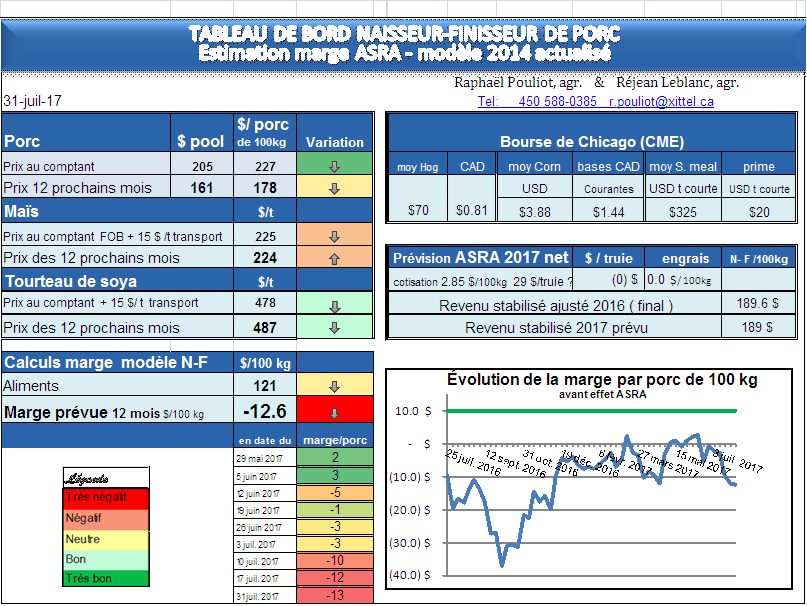 - La marge 1 an est de nouveau en baisse à – 12,60 $/porc.