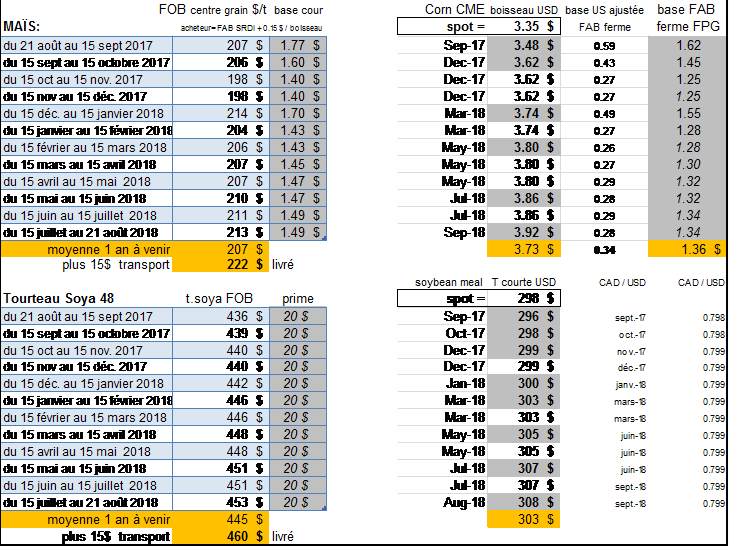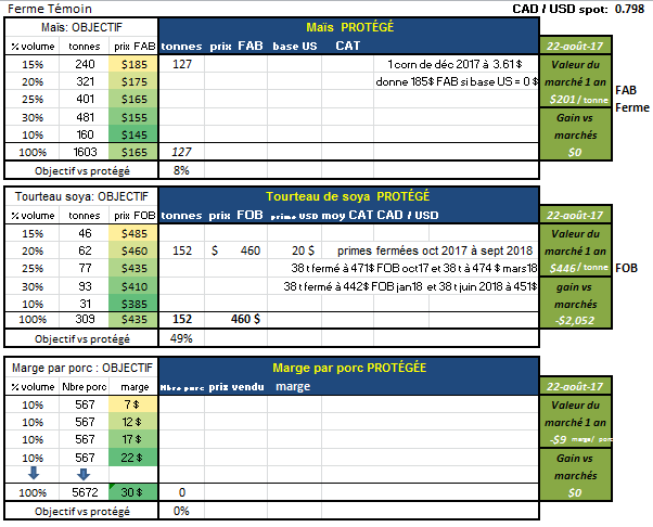 Aujourd’hui mardi 22 août, la ferme Témoin naisseur-finisseur de 306 truies et 5672 porcs à vendre par an va fermer du tourteau de soya, et un peu de maïs également; le tourteau de soya vaut présentement 445 $ FOB plant pour les 12 prochains mois, la ferme en a déjà 2 vans de fermées à 473 $ FOB, elle va en fermer une autre van pour janvier 2018 à 442$ et une pour juin 2018 à 451 $, ce qui portera sont total à 150 t, ce qui représente 50% de ses volumes nécessaires; selon notre charte de déclenchement notre ferme témoin devrait être rendue à 35 % de son volume fermé quand le prix atteint 460 $ FOB sur 12 mois, 60 % fermé si tombe à 435 $ .... Nous sommes rendus à un prix du marché de 445$ , c’est pourquoi la ferme est maintenant rendue à 50% de booké....