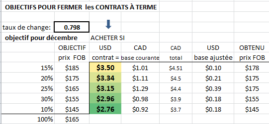 Pour le maïs, notre charte est à 3.50 $ le boisseau US sur décembre pour en fermer 15 % du volume annuel, le prix actuel est 3.61 $ , donc nous n’en fermons que 8%, un contrat de 127 t ( 5000 boisseaux ) , surtout qu’il commence à manquer de temps pour décembre , seulement dans 4 mois. Si la base US ajustée tombe à 0$ en décembre lors de la pression de la récolte, cela nous ferait du maïs à 185$ pris à la ferme, soit le seuil de déclenchement de notre charte d’objectif de maïs. Mais il faut être très prudent dans le maïs quand on ne ferme que le contrat à terme, par exemple le prix actuel spot est 3.35 $ US ( le cash ), et pourtant le prix actuel du maïs au Québec est 200$ FAB, donc pas mal plus cher que ce que le prix aux États-Unis pourrait laisser supposer ( parce que la base US est présentement positive à + 0.58 $ localement... )