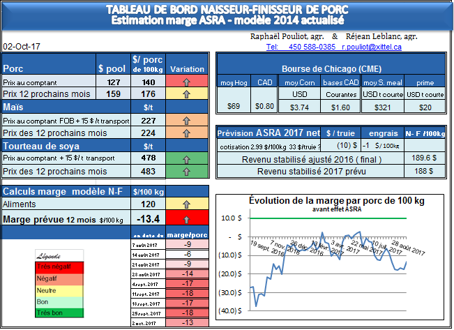 Aujourd’hui lundi, la marge pour l’année à venir dans le porc, du 2 octobre 2017 au 2 octobre 2018, est de – 13.40 $ par porc de 100 kg, naisseur-finisseur.