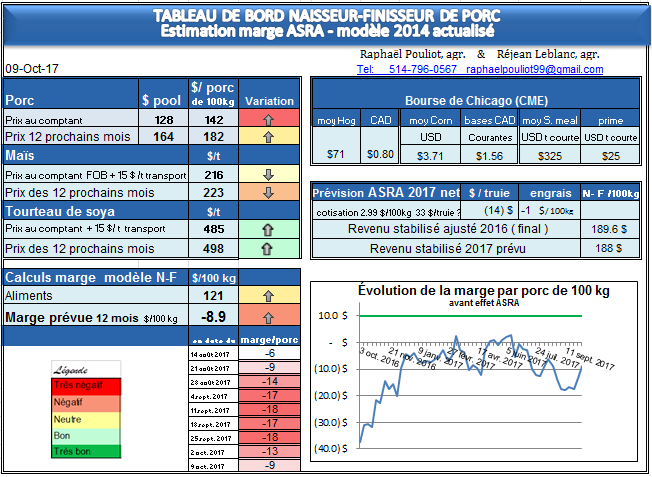Ce lundi 9 octobre, la marge à venir pour les 12 prochains mois à partir d’aujourd’hui, pour la ferme modèle naisseur-finisseur ASRA est de – 8.90 $ par porc de 100 kg carcasse.