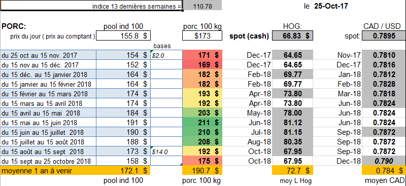Aujourd'hui jeudi 26 octobre, La ferme Témoin de 306 truies et 5672 porcs donne un ordre au SGRM , un ordre ouvert de prendre 100 porcs de cld 4 ( hog d’avril ) si le prix monte à 193 $ ( il y a une base de -2.60 $ dans ce cld, ce serait donc un revenu par porc de 100 kg de 195.6 $ à l'indice moyen Qualité Qc), et de prendre 100 porcs de cld 8 ( hog de août ) s’il atteint 216 $ ( il y a une base appliqué par le SGRM de + 5.99 $, donc ce serait un revenu de 210 $ ). Il ne manque que 3 $ par porc ce matin pour atteindre ces objectifs, 100 porcs par cld correspond à prendre 20% des porcs du mois; il est toujours bon de répartir dans le temps les positions à cause du risque des bases , par exemple de ne pas prendre que juin et juillet… Présentement la ferme Témoin n’a aucune position de porc à la bourse, que du tourteau booké, et un peu de maïs.