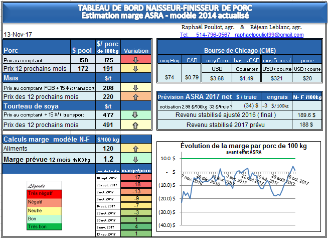- Le taux de change continue de remonter ( 0.79 ), et les lean hog rapprochés perdent des plumes, particulièrement décembre 2017 qui est passé de 68 sous à 62 sous ( on a eu jusqu’à 178$ par porc de possibilité de vente sur décembre en canadien , c’est retombé à 161$ présentement). Les contrats rapprochés sont tirés vers le bas par le prix au comptant aux États-Unis qui a viré de bord, le cash montait chaque jour depuis le début du mois d’octobre, mais ce mouvement s’est arrêté la semaine passée, le prix au comptant vient de reprendre une tendance baissière.... au moins les hog d’été 2018 eux n’ont rien perdu, encore à 83.5 $ US. 172 $ de pool pour les 12 prochains mois, 190$ de revenus de vente à 100 kg.