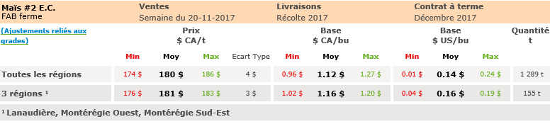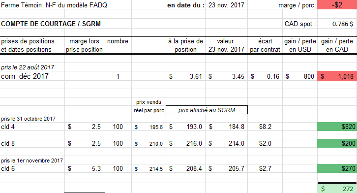 Aujourd’hui 23 novembre, la bourse à Chicago est fermée, mais c’est le temps d’acheter du maïs local : la Ferme Témoin de 306 truies et 5672 porcs vendus par an va en acheter à 180$ FAB comme le prévoit sa charte d’achat ( 195$ la tonne livré à plus de 200$ la tonne livré dépendament des régions ) , ce qui portera son total à 35% de son maïs protégé pour l’année. Le Corn de décembre a remonté à 3.45 $ le boisseau, mais la base est en baisse, on voit cette semaine des transactions à près de 0$ US en base ajustée pris à la ferme sur le SRDI, la moyenne étant 0.15 $ US environ :