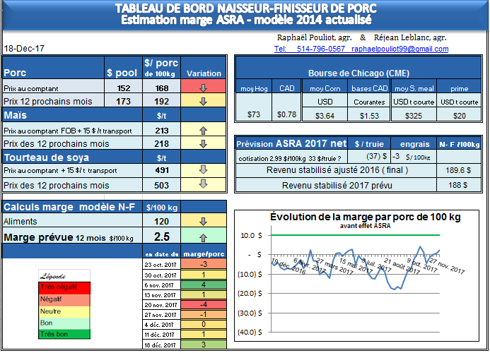 La moyenne du modèle pour la dernière année est de – 5,5 $/porc. Donc, si avec votre travail vous réussissez à sécuriser une marge de +3 ou 4 $/100 kg sur une base annuelle vous pouvez dire travail accompli.