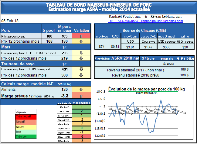 Aujourd’hui lundi 5 février, la marge à venir de la ferme modèle N-F est de – 3$ par porc pour les 12 prochains mois.