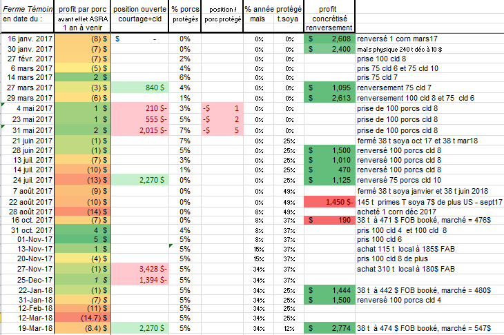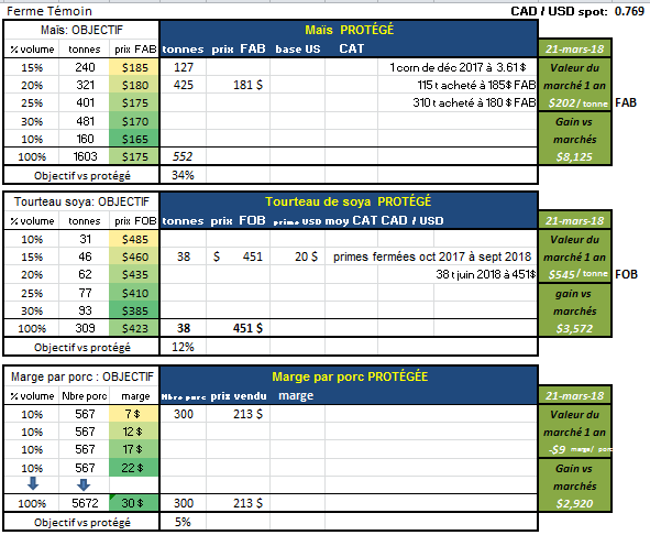 Aujourd’hui la ferme Témoin Naisseur-finisseur de 360 truies et 5672 porcs produits par an, va commander une van de 38 t de son tourteau de soya qu’elle avait booké à 474 $ FOB plant pour mars ( ce booking avait été fait à l’été 2017 ). Il lui en reste un dernier 38 t pour juin qui avait été fermé à 451 $ FOB. Ses primes de tourteau sont fermées jusqu'en septembre 2018, le temps pour fermer les nouvelles primes 2018-2019 approche.
