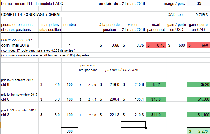 La ferme détient 300 porcs de cld d’été 2018, à profit. Également un contrat de maïs à Chicago, à légère perte. Du maïs avait été acheté au battage à 181$ FOB, le prix actuel est de 200$, tant que les prix tournent autour de 200$ FAB, la ferme Témoin continue d’acheter du maïs au jour le jour, et donc ses achats de novembre dernier restent en entreposage; si le maïs vient à monter durant le printemps/ été, on puisera dans la réserve au lieu d’en acheter; ces 425 tonnes d’inventaires à 135 t par mois prendront 3 mois environ à écouler, au maximum la ferme se mettra à l’utiliser à partir de août.