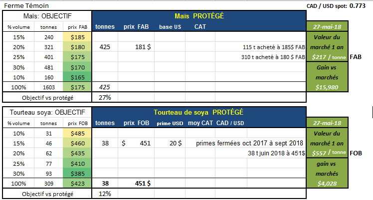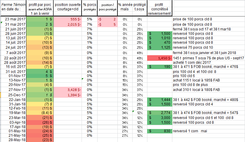 La ferme Témoin de 306 truies et 5672 porcs produits par an ( modèle ASRA ) ne possède plus de positions dans le porc depuis 2 mois, ni dans le grain au CME ( possédait un corn de Mai 2018, mais renversé le 1er mai avec un léger gain; si cette position avait été conservée / roulée , elle vaudrait plus chère aujourd’hui, mais le boisseau valait environ 4.00 $ US, ce n’était plus un prix visé de protection ).