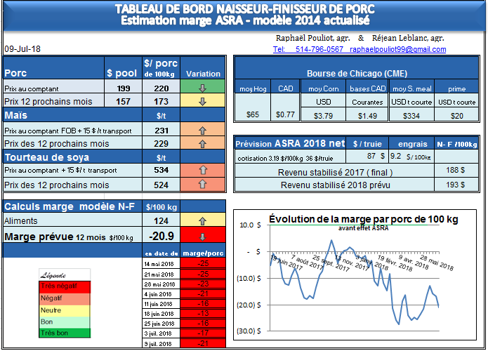 Lundi 9 juillet, la marge repart vers le bas, - 20.9 $ par porc de 100 kg pour les 12 prochains mois...