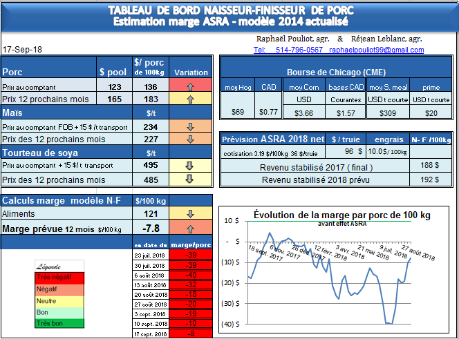 Avec les annonces que les rendements des cultures seront plus importants, les contrats à Chicago ont diminué de façon appréciable. Il est maintenant possible de fermer de nouveau du tourteau en bas de 500 $/t. Pour ce qui est du maïs, malgré des prix de contrats très bas, la base est élevée au Québec, ce qui fait que le prix du maïs 1 an demeure élevé. Pour ce qui est du porc, tranquillement il remonte et il faut donc suivre la valeur des contrats pour le premier trimestre de 2019.