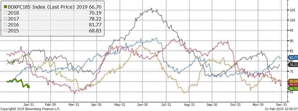 La semaine se résume en quelques mots: vortex polaire et faiblesse des prix. Premièrement, les abattages de la semaine ont été bouleversés par les températures glaciales provenant du nord. Mercredi, les abattages étaient de seulement 261,000 têtes, presque 200,000 porcs n’ont pas été livrés en raison des grands froids (température ressentie à -40C à Chicago). En conséquence, le prix cash jouait au yo-yo, mais aucun signe concret de revirement haussier. Les ventes de jeudi étaient à 57.33¢/lb, à +0.49¢, c’était la seule journée positive depuis plus d’une semaine. Au final, le prix cash a perdu -1.15 ¢/lb cette semaine et il n’est pas aidé par la faiblesse des découpes. Les découpes étaient à 66.70 ¢ ce matin, au plus faible depuis novembre. Il faut garder en tête que depuis la grippe porcine H1N1 en 2009, le creux de la valeur des découpes est de 64 ¢/lb. Nous sommes pas très loin de ce niveau.
