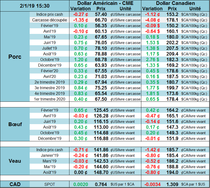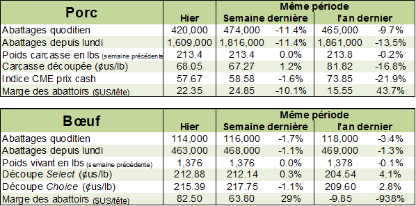 Cette semaine, la production de bœuf était un peu à la baisse en raison des températures très froides qui sont venues ralentir la commercialisation. Les abattages étaient de 593,000 têtes, en baisse de -2.8% et -3.3% la semaine et l’an dernier. Depuis plusieurs semaines, le prix cash a une certaine force en raison des températures froides, mais on n’observe pas vraiment de baisse de poids. Les bêtes vivantes sont toujours à 1375 lbs, soit 3 lbs de moins que l’an dernier, mais les carcasses sont à 830 lbs, soit 2 lbs de plus. Au total, la production de la semaine était de 492.2 millions lbs, en baisse de -2.8% versus l’an dernier.