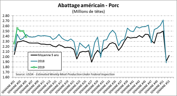 Après plusieurs semaines de production à +5% ou +7%, on a un retour à la normale à cause de la journée d’abattage de mercredi. Le problème est que les 200,000 porcs qui devaient être livrés existent et aboutiront sur le marché la semaine prochaine. Bref, pour cette semaine, les abattages étaient de 2.39 millions têtes, en baisse de -4.6% et -1.9% versus la semaine dernière et l’an dernier respectivement. Le poids est légèrement inférieur à l’an dernier ce qui amène la production à 2.2% sous le volume de 2018, à 509.3 millions lbs. Fort possiblement que la production de la semaine prochaine va être un peu plus importante à cause des livraisons reportées, mais par la suite, on pourrait bien voir les abattages revenir à un niveau plus près de 2018 si on se base sur l’USDA.