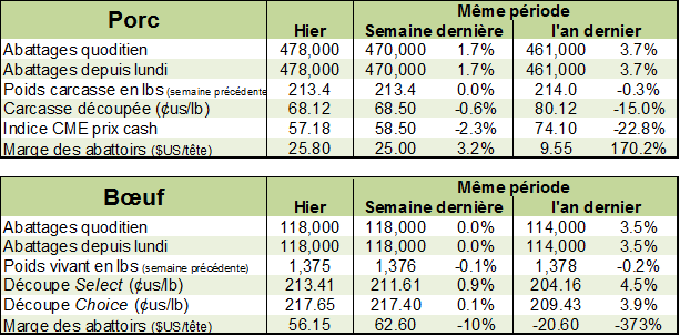 L’élément qui demeure pessimiste pour les prix est le manque de vigueur sur les marchés des découpes… de retour à 67 ¢/lb ce matin et rappel aux traders que la production maintient les prix à terre. De plus, les abattages de lundi étaient de 478,000 porcs, en hausse de presque 4% versus l’an dernier.