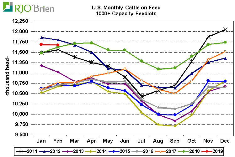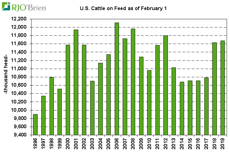 À 15h00 aujourd’hui, l’USDA publiait le rapport Cattle-on-Feed qui devait initialement être publié il y a 2 semaines. Au 1er février, il y avait 11.68 millions de bœufs en parc d’engraissement, soit 0.4% de plus que l’an dernier ce qui tombe dans le haut de la fourchette des prévisions. Depuis 10 ans, il y a seulement en 2012 que le troupeau en parc fût plus gros. Les placements en janvier étaient de 1.96 M têtes, en baisse de -5.3% versus l’an dernier alors que la fourchette des prévisions était de -13% à -4.1%.